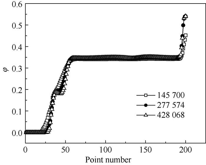 2.4 网格无关性验证为排除网格数量对计算精度的影响,分别使用145 700、277 574和428 068这3种数量的网格进行数值模拟。在釜底中心点和侧壁任一最高点之间的路径上取200个点,路径上的固相分布情况如图 2所示。