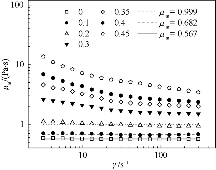 从图 3可以看出,固含率为0(纯甘油)、0. 1以及0. 2时,悬浮液体系表现为牛顿流体特征,使用水平线拟合后发现其黏度分别为0. 567、0. 682、0. 999 Pa ·s。