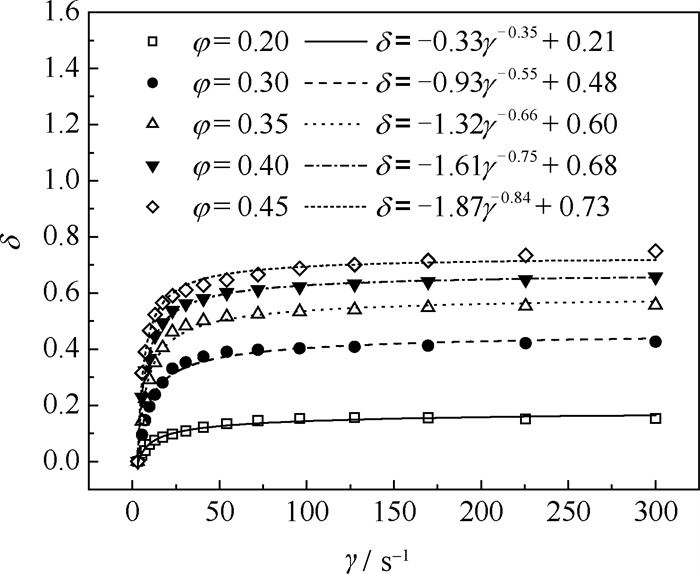 图 5 不同固含率悬浮液的δ与剪切速率之间的拟合关系图 Fig.5 Fitting relationship between δ and shear rate of suspensions with different solid contents |