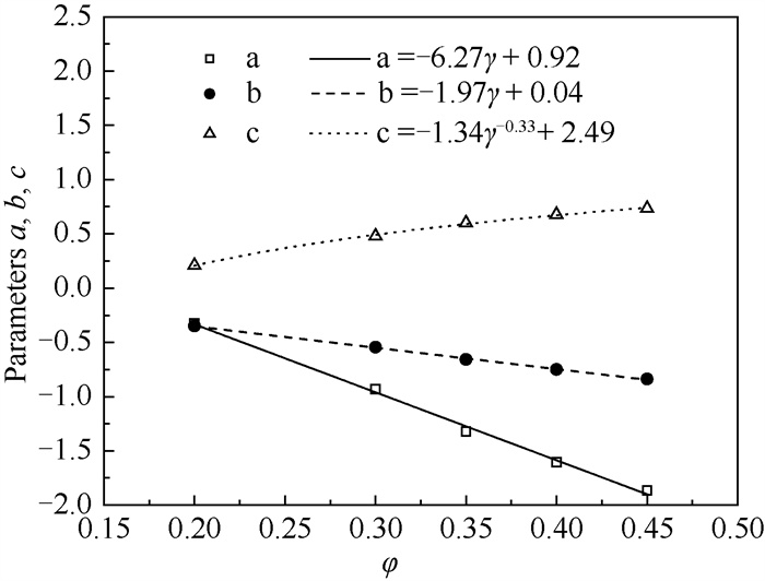 图 5中用来拟合的关系式形式为δ=aγb+c,悬浮液拟合函数中的a、b、c都随着固含率变化,因此分别拟合它们之间的关系如图 6所示。由图 6中的拟合关系可以得到描述剪切速率与固含率之间关系的具体关系式,如式(14)。