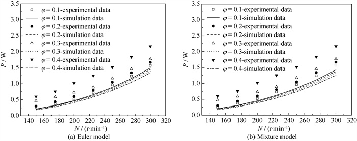 为探究Euler-Euler方法在模拟预测固-液搅拌功率时的具体表现,分别使用Mixture模型与Euler模型对固含率φs在0. 1~0. 4、转速N在150~300 r ·min-1的固-液搅拌功率进行模拟预测,图 8为搅拌功率的模拟结果与实验结果之间的对比图。