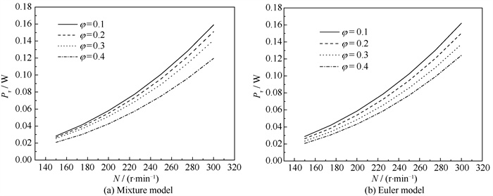 图 9(a)~(b)分别为使用Mixture模型与Euler模型对固-液搅拌功率的模拟值中黏性应力贡献项Pτ与固含率φs以及转速N之间的关系。从图 3的黏度测量实验结果可以看出,固-液两相体系的黏度随着固含率的增大而增大,由此可以推断出,由黏性应力引起的搅拌功率也随着固含率的增大而增大。但从图 9可以看出,黏性应力引起的搅拌功率模拟值随着固含率的增大而减小,进一步证明了Mixture模型与Euler模型中对固-液两相体系的黏度计算模型存在不足。