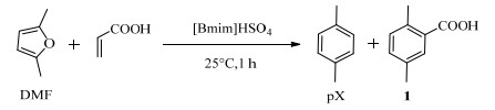 NI等[22]报道了通过一锅两步法在1-乙基-3-甲基咪唑双三氟甲基磺酰亚胺盐([Emim]NTf2)中利用Sc(OTf)3和H3PO4催化DMF和丙烯酸合成pX,DMF转化率和pX得率可分别达到90%和63%。图 5为反应流程:第一步为DMF和丙烯酸在15℃下发生Diels-Alder反应生成中间产物3,3可脱水产生2, 5-二甲基苯甲酸(1)。实验结果表明,3可转化为2,进一步脱水产生pX。第二步则为产物1的脱羧反应,在210℃下采用Cu2O等催化脱羧4 h,进一步提高pX的得率。Diels-Alder反应为热力学控制且反应物浓度对反应有较大影响[59-60],因此研究了丙烯酸与DMF的摩尔比(AA/DMF)对反应的影响。结果表明,在AA/DMF < 6.9时,pX得率随AA/DMF增大而提高,说明较大的AA/DMF有利于反应的进行,而1和3的得率却几乎不随AA/DMF的变化而变化,说明3同时为pX和1的中间产物(如图 5)。研究者还对比了CuCl2、CuBr2和三氟甲磺酸金属盐对于反应的催化效果。相同条件下,CuCl2和CuBr2催化活性较低,可能是由于酸性较弱,难以活化亲二烯体。因此,Lewis酸强度最大的Sc(OTf)3为最佳催化剂。离子液体的阴离子对反应的影响较大,通过实验比较发现,[Emim]NTf2为最佳溶剂。含[NTf2]-阴离子的离子液体具有疏水性且不溶于反应物,极少的量便可极大地提升反应速率,在室温下可提高反应选择性。因此这类离子液体作为溶剂用于Diels-Alder反应,可使脱水反应产生的水与反应体系隔离。实验结果表明,反应体系中加入[Emim]NTf2后,pX的得率有所提高,而产物1的得率却几乎不变,这说明离子液体的加入使得中间产物3更倾向于转化为pX。为进一步提高产物得率和反应选择性,研究者还采用H3PO4为共催化剂以提高脱水效率和产物得率,pX和1的总得率可由59%提高至65%,而反应选择性可由68%提高至92%。总的来说,此法条件温和,操作简单,避免了采用高压乙烯。但是第二步的脱羧反应依然采用高温条件,还需进一步的优化。