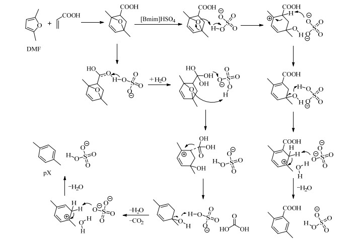 离子液体在Diels-Alder反应中除可用作溶剂外,其本身也可催化该反应[61]。在DMF和丙烯酸合成pX的反应中,由于Sc(OTf)3催化体系存在着副反应较多、产物选择性不够高等缺点,因此Ni等通过研究对此反应进行了进一步的改进[23]。第一步中(如图 6),利用酸性离子液体1-丁基-3-甲基咪唑硫酸氢盐([Bmim]HSO4)一步法催化DMF和丙烯酸发生Diels-Alder反应,25℃下反应1 h,DMF转化率为87%,pX和产物1的总得率可达78%。此外,通过动力学模拟和理论计算,研究者还提出了[Bmim]HSO4可能的催化机理(如图 7)。可以发现,[Bmim]HSO4作为Brønsted酸在脱水反应中起到主要的催化作用,在反应过程中发挥了催化剂和溶剂的双重作用。此法条件温和,操作简单,优势明显,反应在室温下进行,一步制得pX和产物1,芳香族产物选择性高达89%。