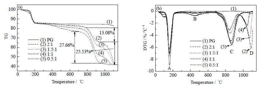 3 结果与讨论 3.1 不同Ca/C摩尔比下TG-FTIR分析分别取Ca/C摩尔比为2、1.5、1等五组在CO2气氛下进行热重-红外联用(TG-FTIR)实验,以CO2为气化剂,具有热量损失少等优点[8],且CO2的引入可以促进煤热解过程的发生,促进羟基、甲基、亚甲基等脱落和芳环结构的开裂,促进挥发分的溢出,降低半焦的产率[9]。磷石膏与褐煤随温度升高的热重曲线如图 1所示。图 1(a)中曲线(1)表示无褐煤加入情况下的磷石膏随温度升高的失重曲线,由曲线(1)可知,磷石膏在CO2气氛下性能较稳定,在200~1100℃,磷石膏的质量由85.14%降低到83.04%,仅仅失重2.10%,磷石膏在这个温度范围内性能稳定,基本不分解。加入褐煤之后,磷石膏在800℃左右即开始失重,说明褐煤的加入可以明显降低磷石膏的还原分解温度。