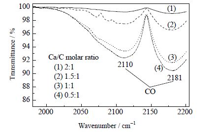图 2 不同Ca/C 摩尔比下第三个DTG 峰值对应的红外谱图 Fig.2 FTIR spectra of the third DTG peak chemicals produced with different Ca/C molar ratios |