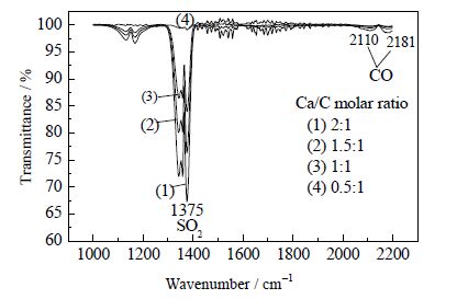 图 2是不同Ca/C摩尔比下第三个DTG曲线峰值对应的红外谱图,从图 2中可以看出,2110 cm-1和2181 cm-1处为C-O键的伸缩振动峰,CO的红外峰强度随褐煤添加量的增加而增加,说明第三个DTG失重是由于煤焦与CO2反应生成CO,CO与热解后的褐煤煤焦均可以与CaSO4发生反应。图 3是不同Ca/C摩尔比下第四个DTG峰值对应的红外谱图,其中1375 cm-1处对应SO2的特征峰(1300~1400 cm-1)。其DTG峰值对应的SO2红外峰强度随着褐煤添加量的增加表现出减弱的趋势,由图 1(b)可知,第四个DTG的峰值也表现出随褐煤添加量的增加而减小的趋势。这说明第四个DTG峰的出现是由于释放SO2引起的失重,生成SO2的量随褐煤添加量的增加而减少。