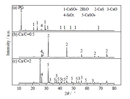 对磷石膏烘干筛分后的原料、Ca/C摩尔比为0.5和2的反应后的固体产物分别进行XRD表征,以确定不同Ca/C摩尔比对磷石膏与褐煤反应后固体产物的影响。所用XRD测试仪为日本理学D/max 2500 PC型X射线衍射仪,Cu靶Kα(λ=0.1540 6 nm)光源,管电压40 kV,管电流100 mA,扫描步长0.02°,扫描范围为10°~80°,所用分析软件为Jade 5.0。测试结果如图 4所示,图 4(a)为经干燥筛分处理后的磷石膏原料XRD谱图,在11.6°、20.7°、29.1°等处出现CaSO42H2O的特征衍射峰,此外还出现SiO2的特征峰;图 4(b)为Ca/C摩尔比为0.5时反应后的XRD谱图,在27.1°、31.6°、44.9°等处出现明显的CaS的特征峰,说明这个摩尔比例下的产物主要为CaS;图 4(c)为Ca/C摩尔比为2时反应后的XRD谱图,由于这个比例磷石膏过量,样品中主要为CaSO4和CaO的物相。
