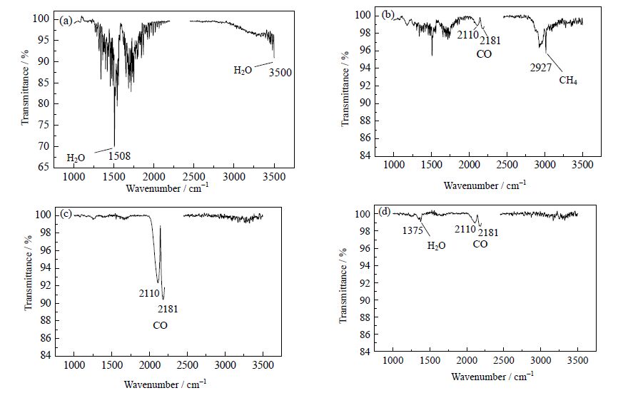 图 6 Ca/C=0.5 时不同DTG 峰值对应的气体红外谱图 Fig.6 FTIR spectrum of the four DTG peak chemicals produced with Ca/C molar ratio 0.5 (a) 156℃, 577 s (b) 447℃, 1265 s (c) 873℃, 2563 s (d): 1091℃, 3053 s |