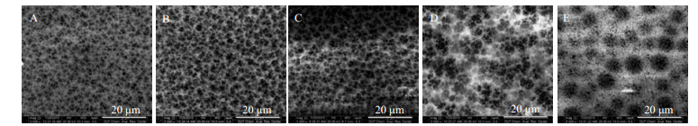 3 结果 3.1 膜表面形貌分析图 1为MPVDF、M21、M32、M11、M23的扫描电镜照片。由图 1可以看出,所制备的MPVDF与四种PVDF-g-PNIPAAm膜表面均呈现蜂窝状孔结构,大孔内套着小孔,孔径大小在1~10 μm。观察图 1A~1E可知,膜表面孔径随着NIPAAm反应比的增加而增大,这主要是由于NIPAAm链段的致孔作用所致。