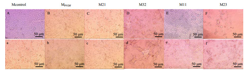 图 2 不同时间不同基底表面上Hela细胞的生长状态 Fig.2 Hela cells cultured on different surfaces at different times (A, B, C, D, E and F are Hela cells grow on the surfaces of conventional culture plate, PVDF membrane, PVDF-g-PNIPAAm membrane M21, M32, M11 and M23, respectively at 24 h; a, b, c, d, e and f are Hela cells grow on these different surfaces at 72 h.) |