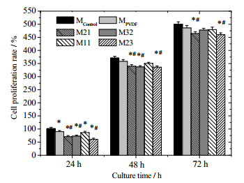 图 3 Hela细胞在不同基底表面上的增殖率 Fig.3 Proliferation rate of Hela cells on different surfaces. *p < 0.05, statistically different from control group; #p < 0.05, statistically different from MPVDF group. |