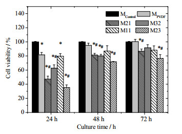 图 4为培养至24,48,72 h后,不同基底表面上Hela细胞的活率。可见,培养至24 h时,MPVDF、M21、M32、M11和M23上细胞活率均显著性低于MControl孔板表面,同时四种温敏膜除M11外其它三种温敏膜上细胞活率均显著性低于MPVDF组;随着培养时间的延长,细胞逐渐适应了这一生长环境,其生存能力得到了一定提高,到72 h时,在M32和M11上的细胞活率分别达(91.58±4.43)%与(88.25±6.09)%,与MControl及MPVDF组相比均无显著性差异。