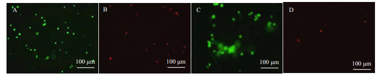 图 6 不同方法收获的Hela细胞死活染色 Fig.6 Live/dead fluorescence staining of Hela cells harvested by different methods (A and B are living cells and dead cells, by trypsinization, respectively; C and D are living cells and dead cells, by temperature droping, respectively) |