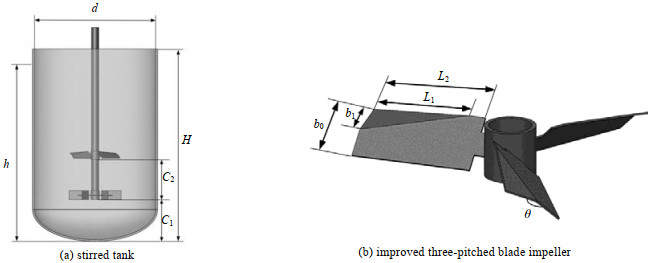 图 1 搅拌槽及改进型三斜叶桨结构尺寸图 Fig.1 Structural sizes of the stirred tank and the improved three-pitched blade impeller |
