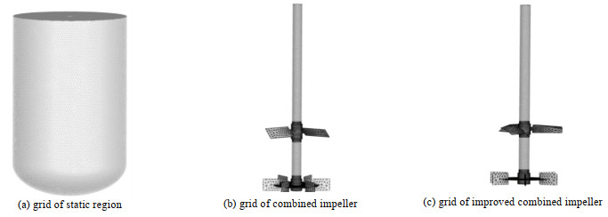 2.2 建模与网格划分通过三维建模软件分别对搅拌槽、改进型三斜叶-Rushton组合桨及三斜叶-Rushton组合桨进行模型构建,搅拌槽模型高度为液位高度h,完成之后导入ANSYS分析软件的Workbench模块当中,划分流体域后再进行流体域的布尔运算。由于研究的组合桨附近的结构较为复杂,对于结构化网格的划分相对困难,所以研究的几何模型采用非结构化四面体网格。为了保证计算域的精确性,对上下层桨叶和搅拌轴附近区域进行网格加密处理,划分网格结构模型如图 2所示。
