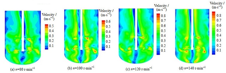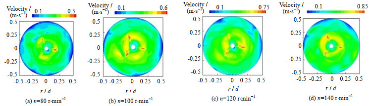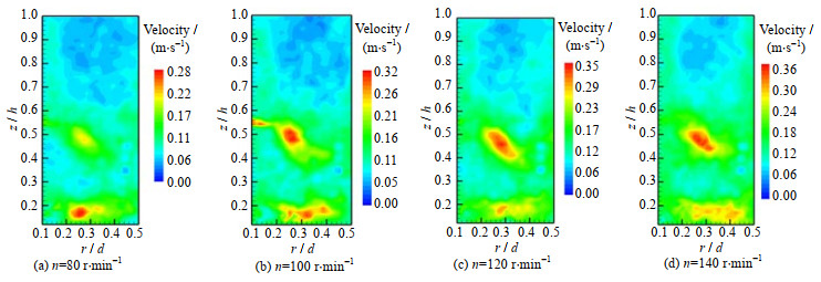 实验工况与模拟相同的4种不同转速下的速度云图如图 7所示。当n=80 r·min-1时,实验功率为2.502 W,流场中的速度峰值偏小,在0.18 < r/d < 0.5,0.61 < z/h < 1.0上桨叶区域内速度较低,且两桨叶间也呈现出低速不均匀的现象。当n=100 r·min-1时实验功率为4.677 W,流场的整体速度在增大,上桨叶区的低速区域在径向和轴向上的范围缩小为0.21 < r/d < 0.5,0.64 < z/h < 1.0。上层改进型三斜叶桨的轴流特性形成的斜向下的射流表征较明显,且两桨叶之间的速度分布相对均匀。当n=120 r·min-1时,实验功率为7.794 W,搅拌转速提升使搅拌槽内整体速度增大,射流产生的高速区域沿斜向下的方向延伸,混合程度在进一步增强,但搅拌槽内速度分布无明显变化。当n=140 r·min-1时,实验功率为12.058 W,虽然上桨叶区的较低速度区域的范围在减小,但功耗较大不利于降低能耗。转速的提升对桨叶区域速度分布没有明显改善,最佳转速n为100 r·min-1。