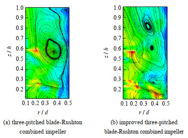 当n=100 r·min-1时,2种不同组合桨的速度流线云图如图 5所示。图 5(a)中三斜叶-Rushton组合桨中三斜叶桨对Rushton桨的作用相对较弱,未能在Rushton桨形成射流的上侧形成涡旋。观察图 5(b)中速度流型云图的变化,与图 5(a)相比Rushton桨形成射流的方向为斜向下方,在射流上侧形成涡旋。由于改进型三斜叶桨折边上侧的流体沿折边运动,下侧的流体受到折边刮挡的作用,所以其泵吸作用相对于三斜叶的泵吸作用更强,轴向对流循环性能更好。改进型三斜叶桨对Rushton桨形成的射流具有更强影响,缩小了搅拌槽底部和内壁附近的低速区域,且射流的上侧有涡旋形成,增强了整体循环性能。当n=100 r·min-1时,三斜叶-Rushton组合桨的计算功率为4.424 W,而改进型三斜叶-Rushton组合桨为4.246 W,能耗更低,这是由于三斜叶桨没有折边的存在,叶片所受桨叶周边流体的阻力较大。