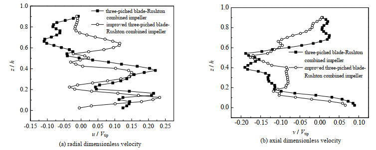 图 6为n=100 r·min-1时径向位置r/d=0.3处的无因次化速度分布。图 6(a)中2种组合桨的上桨叶区出现了相反方向的速度分布,主要是因为改进型三斜叶桨的泵吸作用较强,增强了桨叶附近流体区域的湍动能,在上桨叶区出现了涡旋,而在三斜叶桨-Rushton组合桨槽内的上桨叶区则没有出现涡旋。2种不同的组合桨形成的射流及两桨叶间的径向无因次化速度的趋势大致相同,但在Rushton桨附近的u/Vtip值改进型三斜叶-Rushton组合桨大于三斜叶-Rushton组合桨。观察到图 6(b)中2种组合桨的轴向无因次化速度分布的趋势相一致,与图 6(a)径向无因次化速度分布不同的是三斜叶-Rushton组合桨两桨叶间的v/Vtip值大于改进型三斜叶-Rushton组合桨,但这对于整体的速度分布的影响较小。