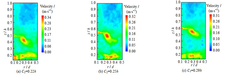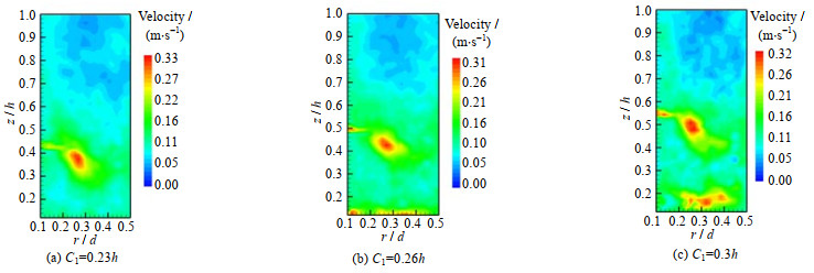 在甘油-水溶液中n=100 r·min-1和两桨间距离C2=0.25h的条件下,3种不同离底距离对流场产生影响的速度云图分布如图 9所示。当离底距离C1=0.23h时,上桨叶区的流体的搅拌效果较差,出现大面积的低速区域。在下桨叶区,Rushton桨浸没在槽底,流体的流动主要在槽底区域。当C1=0.26h时上桨叶区的低速区域相对离底距离C1=0.23h有所缩小,由0.56 < z/h < 1.0,0.16 < r/d < 0.5缩小为0.64 < z/h < 1.0,0.18 < r/d < 0.5。当桨叶离底距离提升至C1=0.3h时,如图 9(c)较低速区域在进一步缩小,搅拌效果增加明显,槽内的混合能力增强,但槽底流体的高速区域上移。离底距离进一步增大会使高速区域继续上移,槽底流速过低会导致槽底沉积物料、堵塞出料口,故最佳离底距离C1为0.3 h。