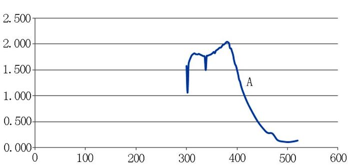 1.3.2.2 最大吸收波长的测定用1 cm比色皿,以蒸馏水为空白为参比溶液,在300~520 nm之间,每隔10 nm测一次吸光度,在最大吸收峰附近2 nm测定一次吸光度.
