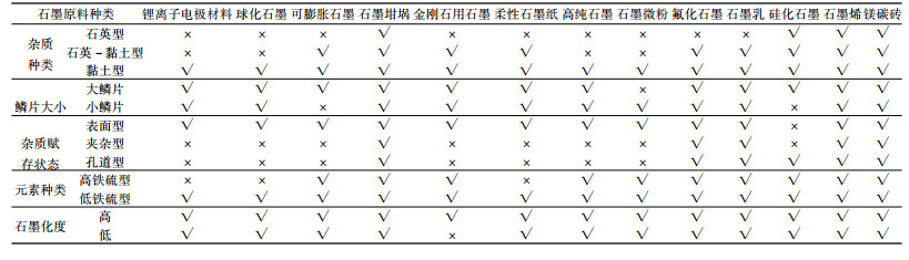 (2) 针对下游差异化的石墨产业需求建立石墨原料质量分级新体系。不同地区的石墨资源特性不同,石墨矿石类型不同,共伴生矿物不同,导致其石墨矿石质量也不同,应用领域不同,价值亦不同。面对石墨单矿种多用途的特征,进行石墨矿石质量分类,建立不同石墨矿石类型与不同深加工产品的对应关系,指导石墨资源的高值化利用。由于石墨高附加值产品通常要进行高纯和膨胀处理,建议重点考虑石墨精粉的可高纯性以及可膨胀性。将石墨矿石根据其杂质种类的不同,分为黏土型、石英型以及石英黏土型;根据其粒径大小的不同,分为大鳞片石墨和中小鳞片石墨;根据石墨中杂质的赋存状态不同又可以分为孔道型、表面型及夹杂型;根据石墨鳞片的结晶程度可以分为良好的石墨化度和差的石墨化度;根据石墨矿石中所含元素的种类可以分为高铁硫型与低铁硫型等。