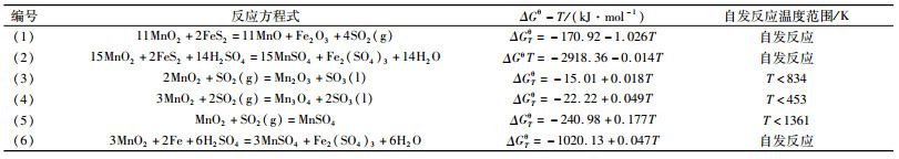 | 表 2 不同还原剂与MnO2的反应方程式以及对应的ΔGθ-T方程式 Table 2 Reactions of different reducing agents and MnO2 and corresponding ΔGθ-T equations |