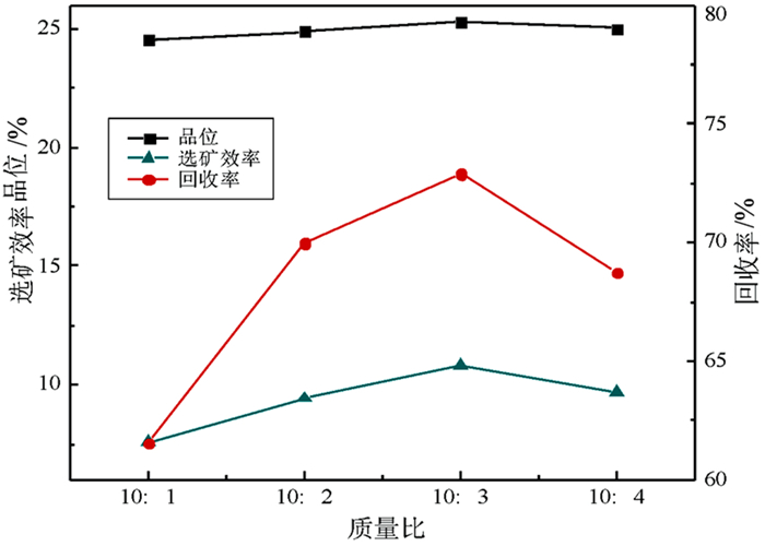 从图 1中可以看出物料配比不同,合成药剂浮选指标也各不相同。随着乳酸所占比例增大,精矿回收率总体呈明显增加趋势,精矿品位则呈现出先升高后降低的趋势,其中回收率变化明显,精矿P2O5品位变化较小。当棉油酸与乳酸物料质量配比为10 : 3时,精矿P2O5品位为25.29%,回收率72.89%, 选矿效率10.81%,精矿P2O5品位和回收率、选矿效率都达到最高值,继续增大乳酸比例时,精矿P2O5品位和回收率开始下降,故确定棉油酸与乳酸质量配比为10 : 3。