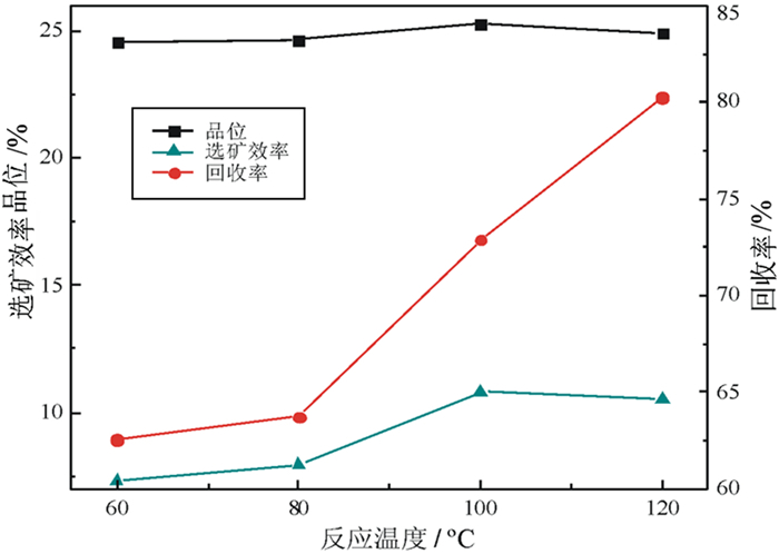 从图 2中可以看出反应温度不同,合成药剂浮选指标也各不相同。随着反应温度的升高,精矿回收率明显增加,当反应温度小于100 ℃时,精矿P2O5品位、选矿效率呈上升趋势,当温度为120 ℃时,二者略有降低。反应温度为100 ℃时精矿P2O5品位最高为25.29%,回收率72.89%,选矿效率10.81%。反应温度为120 ℃时精矿P2O5品位为24.89%,选矿效率10.52%,略有下降,但回收率最高,为80.25%,故综合考虑确定反应温度为120 ℃。
