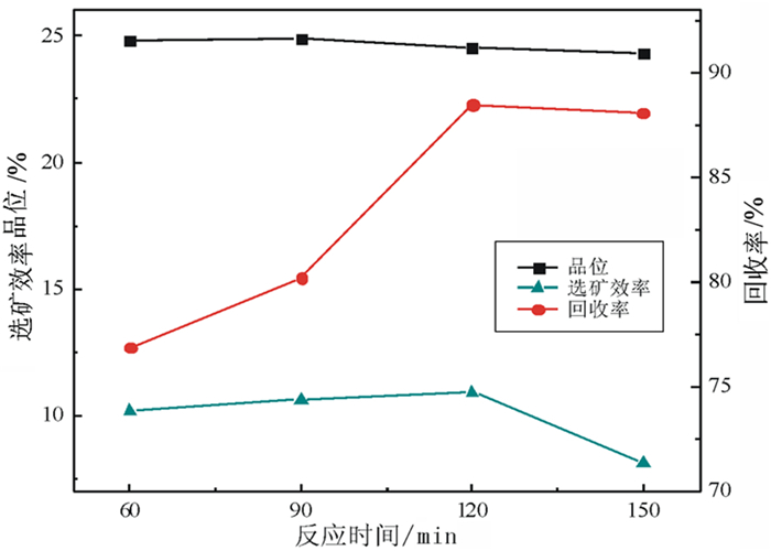 从图 3中可以看出随着反应时间的延长,精矿P2O5品位呈下降趋势,回收率、选矿效率则呈现出先升高后降低的趋势。当反应时间为120 min时,精矿P2O5品位为24.54%,回收率最高为88.51%,选矿效率最高为10.93%。当反应时间为150 min时各浮选指标都开始下降,故确定反应时间为120 min。