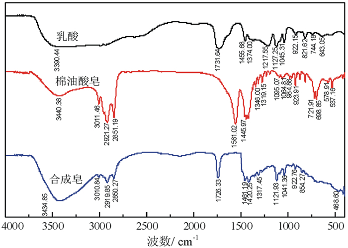 2.4 红外光谱测试将棉油脂肪酸跟合成药剂皂化后得到的皂化产物以及乳酸在Nicolet6700型傅立叶红外光谱仪进行表征,红外光谱见图 4。