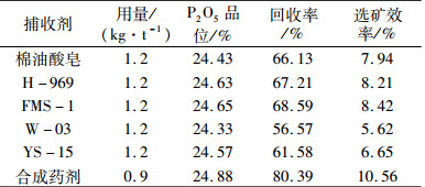 (3) 药剂对比试验表明合成药剂对中低品位胶磷矿有较高的选择性及捕收能力。在原矿P2O5品位21.56%、浮选温度20 ℃、药剂用量0.9 kg/t条件下,经过正浮选一次粗选得到精矿P2O5品位24.89%、回收率80.39%、选矿效率10.56%的浮选指标。无论从品位、回收率、选矿效率还是药剂用量上比较,均远优于其它四种工业化药剂以及原料棉油酸皂。
