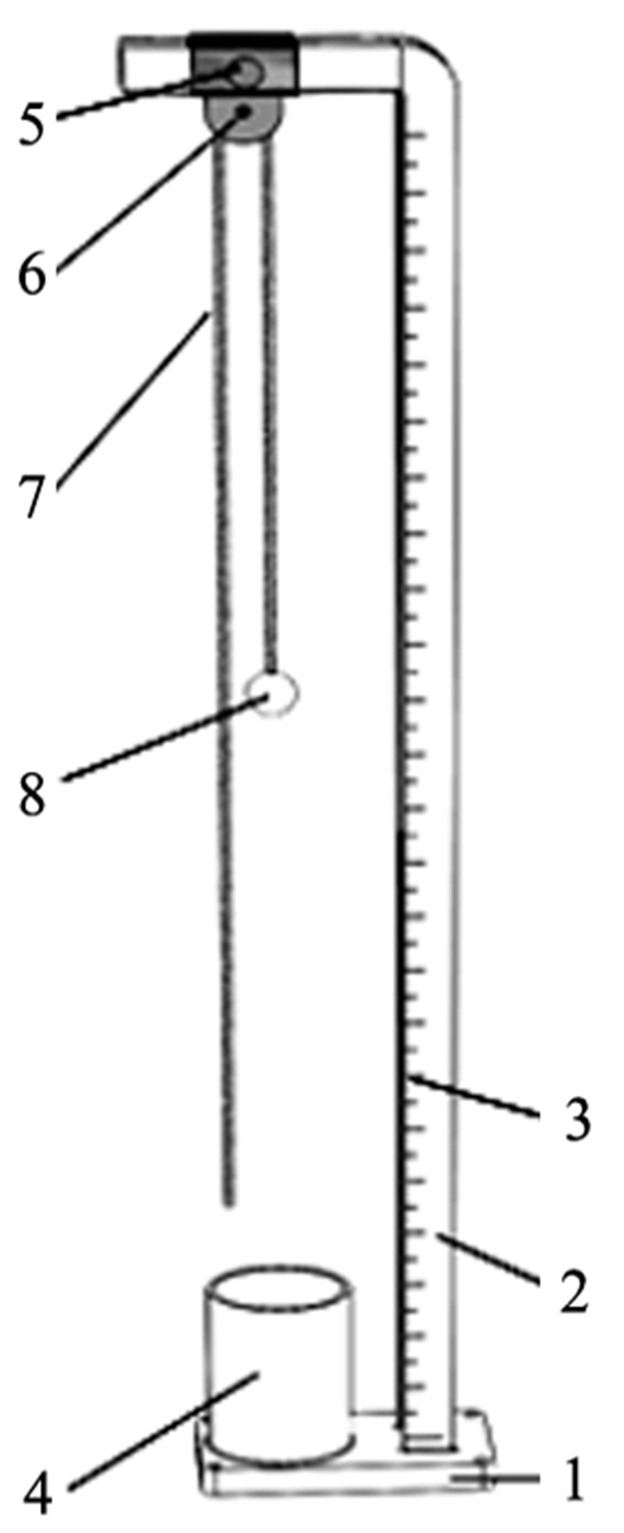 | 1-底座;2-工字钢支架;3-标尺;4-料筒;5-滑块;6-定滑轮;7-钢丝绳;8-钢球 图 1 矿石冲击破碎特性测定装置 Fig.1 Installation used for measuring impact fragmentation characteristics of ores |