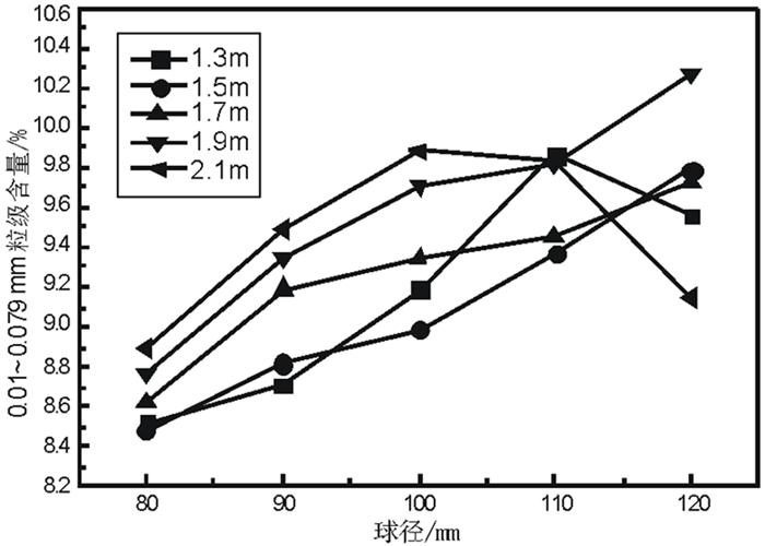 由图 2可知,当钢球下落高度为1.3 m或2.1 m时,随着钢球直径的增加,破碎产物中0.01~0.079 mm粒级的含量均呈现出先增大后减小的变化趋势;当钢球下落高度分别为1.5 m、1.7 m或1.9 m时,随着钢球直径的增加,破碎产物中0.01~0.079 mm粒级的含量均呈现出逐渐增加的趋势;当采用120 mm直径的钢球以1.9 m高度自由落下时,破碎产物中0.01~0.079 mm粒级的含量取得最大值(10.27%)。