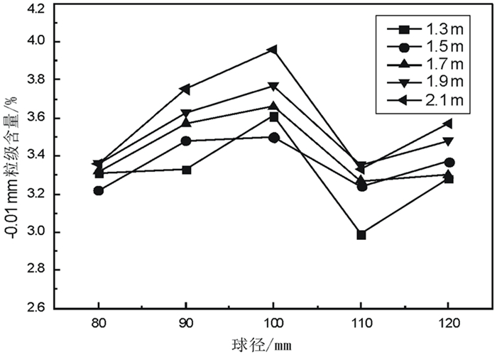 由图 3可知,当钢球下落高度由1.3 m逐渐增加到2.1 m时,随着钢球直径的增加,破碎产物中-0.01 mm粒级的含量均呈现出先增大后减小然后再增大的变化趋势;当采用110 mm直径的钢球以1.3 m高度自由落下时,-0.01 mm粒级含量取得最小值(2.99%)。