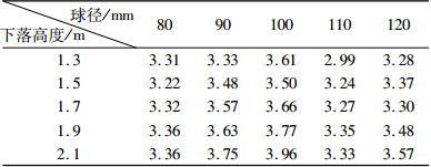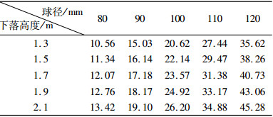 针对表 1所示的矿石样品,采用直径分别为80、90、100、110、120 mm的5种钢球,下落高度依次设定为1.3、1.5、1.7、1.9、2.1 m进行了冲击破碎试验。钢球接触矿样瞬间的动量如表 2所示。矿石冲击破碎特性的测试结果如表 3、表 4和图 2、图 3所示。