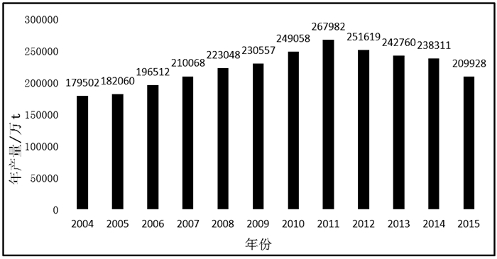 | 图 1 2004—2015年砂石土类矿产年产量 Fig.1 Annual production of the gravel soil minerals from 2004 to 2015 (数据来源:中国国土资源统计年鉴) |