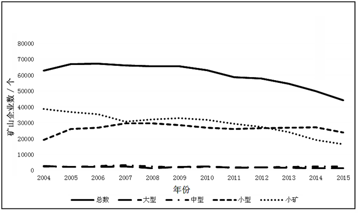 | 图 2 2004—2015年砂石土类矿产矿山企业数变化趋势 Fig.2 Number of the gravel soil minerals enterprises from 2004 to 2015 (数据来源:中国国土资源统计年鉴) |