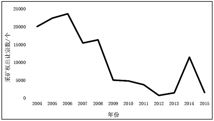 | 图 3 2004—2015年砂石土类矿产采矿权出让宗数 Fig.3 Number of the gravel soil minerals′s mining rights to sell from 2004 to 2015 (数据来源:中国国土资源统计年鉴) |
