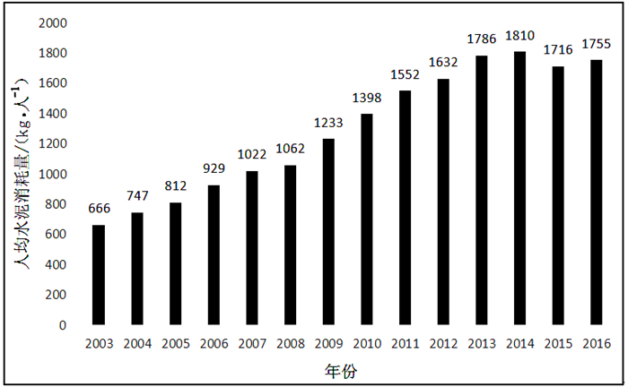4 砂石土类矿产发展面临的挑战 4.1 砂石土类矿产的未来需求预测在建筑用料中,水泥和砂石密不可分,一般水泥和砂石的使用量比例(质量比)约为1 GA6FA 6,二者消费量的整体趋势大致相同,因此我们这里用人均水泥消费量情况来推测砂石土类矿产的消耗趋势。如图 4所示是2003—2016年中国人均水泥消费量情况,在2003—2014年间,我国人均水泥消耗量呈整体上升的趋势,在2014年达到峰值,人均水泥消耗量为1 810 kg。到2015年下降到1 716 kg,2016年略有回升。通过我国人均水泥消费量情况,我们可以推断砂石资源的需求情况也大致会呈现整体上升的趋势。