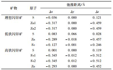 | 表 1 理想闪锌矿、低铁闪锌矿和高铁闪锌矿表面弛豫 Table 1 Atoms displacement of ideal sphalerite、low iron and high iron surface |