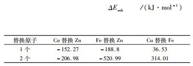 | 表 2 闪锌矿表面铜、铁的替换能 Table 2 Substitution energy of copper and iron atoms on the surface of sphalerite |