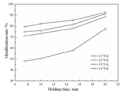 | 图 1 还原温度和时间对金属化率的影响 Fig.1 Influences of temperature and holding time on metallization rate |