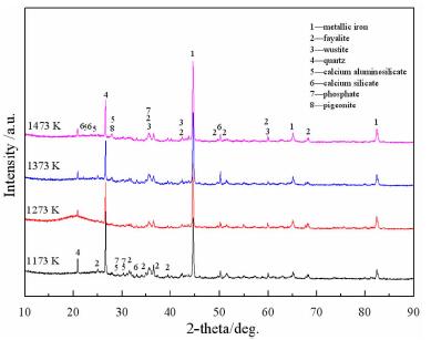 对各温度下还原20 min的样品进行X射线检测分析,结果见图 2所示。从下到上,四个样品的金属化率分别为77.6%、88.7%、90.4%和92.6%。如图 2所示,它们的物相组成相似。根据物相含量与衍射峰强度之间关系,物相组成含量按顺序分别为金属铁、石英、铁橄榄石(Fe2SiO4)、钙铝硅酸盐(CaAl2Si2O8)、铁浮氏体(FeO)、辉石[(Ca, Mg, Fe)(Mg, Fe)Si2O6)、硅酸钙(Ca3Si2O7)和磷酸盐(如Ca2P2O7, Al(PO3)3, SiP2O7、Fe(PO3)3等]。因为鲕状赤铁矿的矿石特点[23],铁橄榄石与磷酸盐、铁橄榄石与浮氏体、钙铝硅酸盐与辉石、钙铝硅酸盐与磷酸盐等形成共晶化合物,表明它们在原矿石中呈紧密共生。