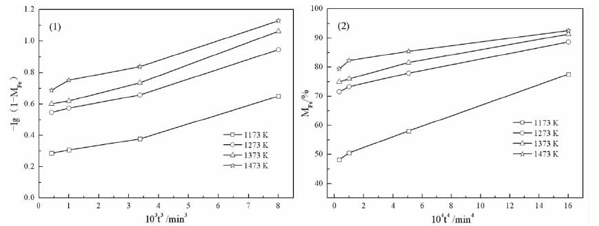 | 图 3 -lg(1-MFe)与t3关系图(1)及MFe对t4关系图(2) Fig.3 Relationships between -lg(1-MFe) vs t3 (1) and MFe vs t4 (2), respectively |