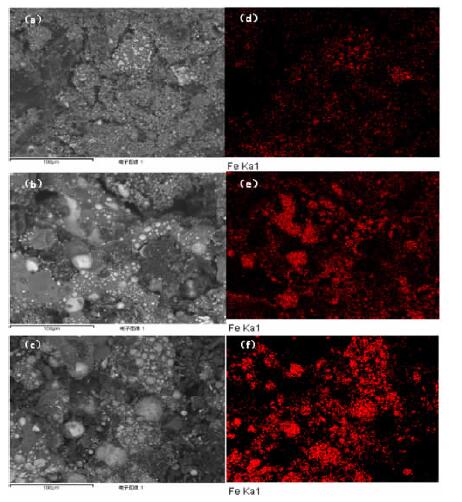 采用扫描电镜和能谱仪对1 473 K下不同还原时间样品的微观形貌与铁元素分布进行了观测分析,如图 5所示。图 5中a、b、c三个样品对应的还原时间分别为7.5 min、15 min和20 min,d、e、f分别对应a、b、c三个视场的铁元素分布。图 5表明,随着还原时间延长和还原程度提高,铁晶粒逐渐链接、聚集,逐渐富集,趋向于形成较大颗粒铁晶粒与铁链晶。鲕状赤铁矿中的部分铁氧化物呈弥散分布、极难聚集长大,利用微波加热的热点效应,可为铁晶粒的聚集长大提供条件。