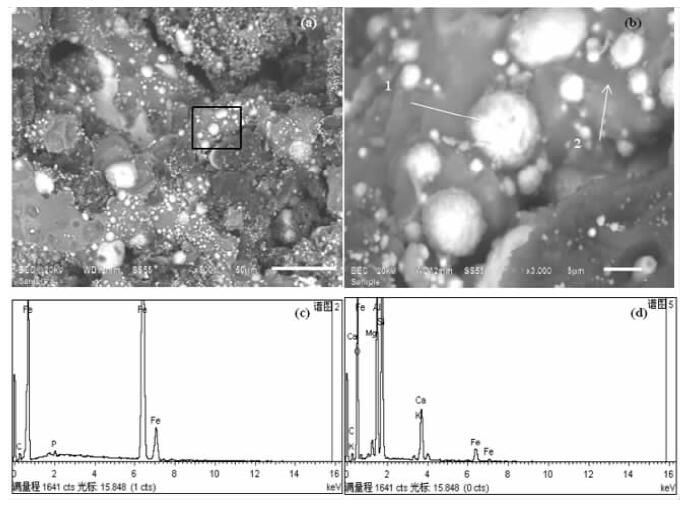 进一步观察分析了1 473 K下还原时间15 min的金属化球团的铁晶粒形貌与元素组成,结果见图 6所示。图中a为500倍视场,b为a视场中黑色方框部分的放大视场,c、d为b视场中1、2点位处的能谱分析结果。从图a、b可以清晰看到铁晶粒的生长形态部分为球形熔滴状、部分为蠕虫状链晶,视域内最大单个铁晶粒尺寸约为10 μm。当晶胚达到某一临界尺寸后,就成为可以稳定存在并自发长大的晶核,这一过程称为形核,图中大小不一的铁晶粒反映其初始形核、逐渐合并长大的过程。图c、d显示,能谱点1处主要元素为Fe,并含有微量C和P;能谱点2处主要元素为O、Al、Si、Ca和Fe,对应为脉石成分。铁晶粒中的C源于还原过程发生的渗碳,P源自于少量胶磷矿被还原进入铁晶粒形成Fe-P合金。本文重点在于描述微波还原过程中铁晶粒的形核与生长行为,而实验样品球团在1 273 K微波还原15 min时金属化率大于70%,并且该温度下形核速率常数和生长速率常数均较大,有利于铁晶粒的形核生长聚集,在我们已发表的工作中[1, 2],利用该还原条件在球团中加入脱磷剂、碱度剂并降低还原温度,可有效实现鲕状赤铁矿的提铁脱磷。