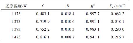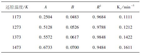 1.3 动力学模型采用Avrami-Erofeyev模型研究还原过程中金属铁晶粒成核长大速度,侧重于研究铁晶粒形核-生长过程,其动力学方程如下[20-22]:
