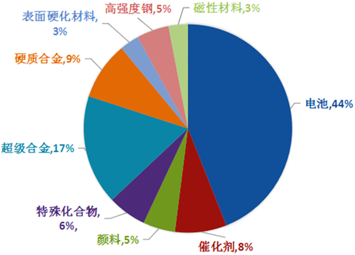 钴优异的性质使其在众多领域得到广泛的应用,钴产品主要以化学品和金属的形式应用于电池材料、催化剂、颜料、高温合金、硬质合金和磁性材料等领域。目前,电池行业是消耗钴最多的行业,钴主要用于制备锂离子电池的正极材料,钴可以提高锂离子电池的稳定性和安全性,改善电池的循环性能,从而提高电池的寿命。钴与镍、铬、钼和钨等元素构成的钴基超级合金在高温下仍能保持高强度、耐磨性和耐腐蚀性,是用于喷气飞机发动机和燃气轮机的主要原料,因此,制备超级合金也是钴的主要应用领域。