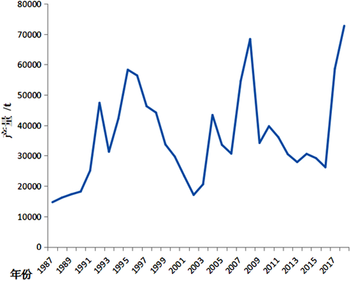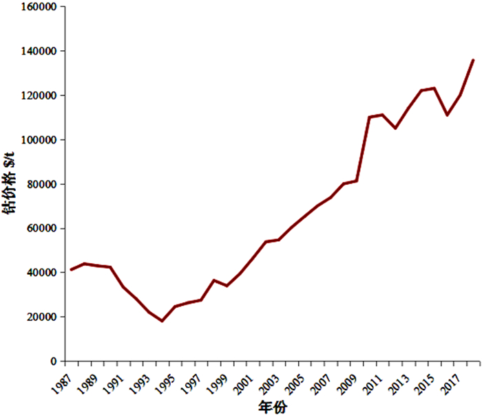 钴属于小金属,相对于基础金属而言,钴矿资源储量小,品位低,且钴主要与铜和镍矿产共伴生,生产成本比较高。尽管人们努力减少钴的用量或用其他原料替代钴,但最近三十年来,全球钴矿产量在波动中不断增长[10],钴矿产量从1988年的4.4万t增长到2018年的13.57万t,年均增长率达到3.8%,近30年钴的产量变化见图 4。